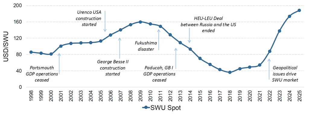 Enrichment increases the concentration of fissile uranium-235 in UF₆ using separative elements such as gas centrifuges. Enrichment services are sold as Separative Work Units (SWU). The U.S. has one LEU enrichment facility operated by Urenco in New Mexico; however, HALEU production remains nascent and heavily reliant on foreign entities.